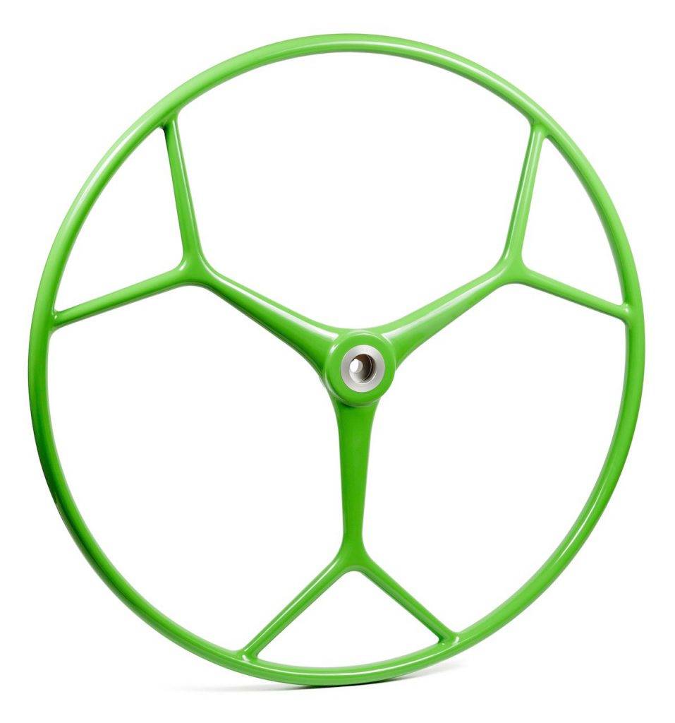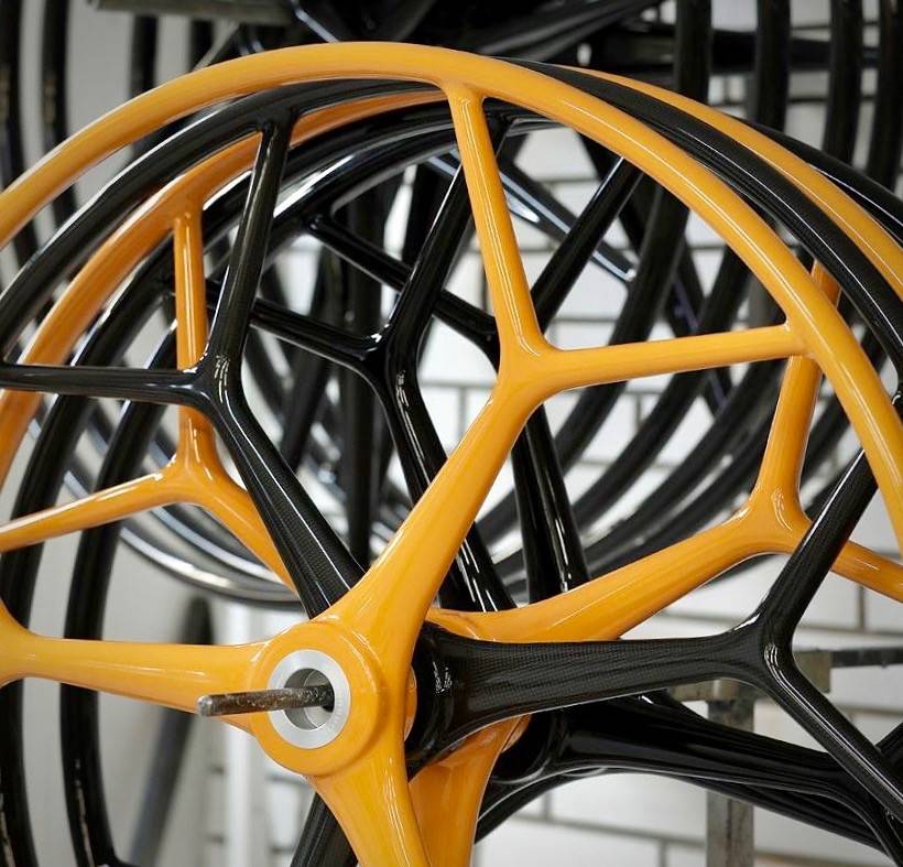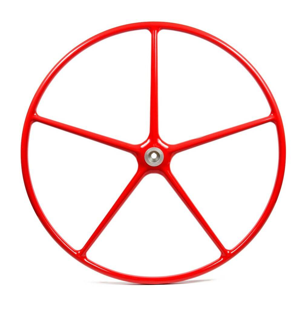 Les barres à roue en fibre de verre carbonautica sont fabriquées comme les barres à roue carbone, en une seule pièce sans collage, donnant une structure monocoque très résistante. Le moyeu en aluminium anodisé est intégré dans le moule qui est peint avant la mise en place de sorte que la roue quitte le moule finie.